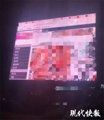 Ya, itulah yang terjadi di jalanan kota Liyang, Jiansung, China. Alih-alih memutarkan iklan-iklan produk yang menarik, videotron ini malah menampilkan interface sebuah situs porno.